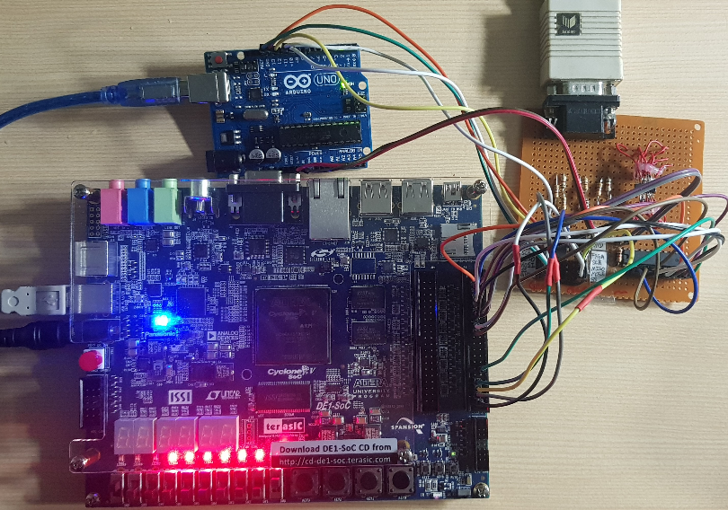Detail: We have designed a UART communication interface for FPGA and Arduino interface. Before designing the interface we must first understand the proctocol from the arduino side. We make a simple chating program and use an oscilloscope to see the protocol. Then we develop the IP from reciever to Transmitter step by step. After numerous testbenches we integrate the system into a top file, synthesis and again test whether the UART is working well by using a oscilloscope.However we must note that since the voltage system is different between Arduino(5V) and FPGA(3.3V) a voltage shifter is needed.