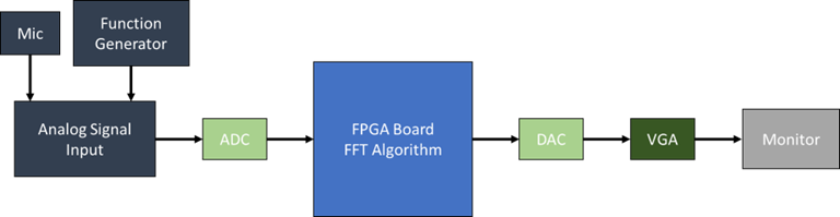 Detail: We have made a very simple spectrum analyzer using the DE1-SoC Board. This project starts from sampling signals from the function generator. The signal is sampled using the LTC2308 chip on the board. We can sample up to 250kHz(Sampling Rate: 500kHz). The digital signal is then processed through the FFT Module. This module will input real values(Constraints :No modulated signals input) and will return a magnitude and frequency. This information will be printed via VGA Memory, which is controlled by the VGA Controller. The controller will case each magnitude and freqeuncy to a given slot and will update the screen by page (640x480 @60hz Display).
